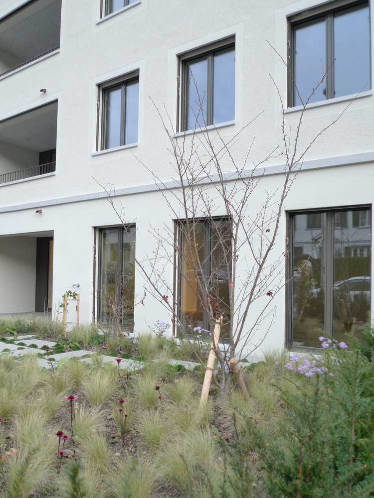 Rückwärtig entstand ein halbprivater Hofraum für die Bewohner. Unter diesem Hofraum befindet sich die Einstellgarage für Velos und Autos. Die Gliederung der Gebäude in Sockel, Mittelteil und Dach erfolgt in erster Linie durch den Wechsel der Putzstrukturen und der Gesimse/Gurten.