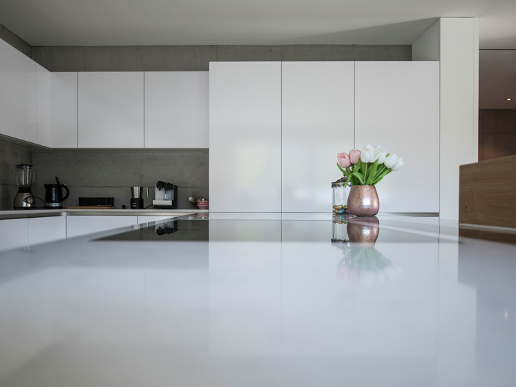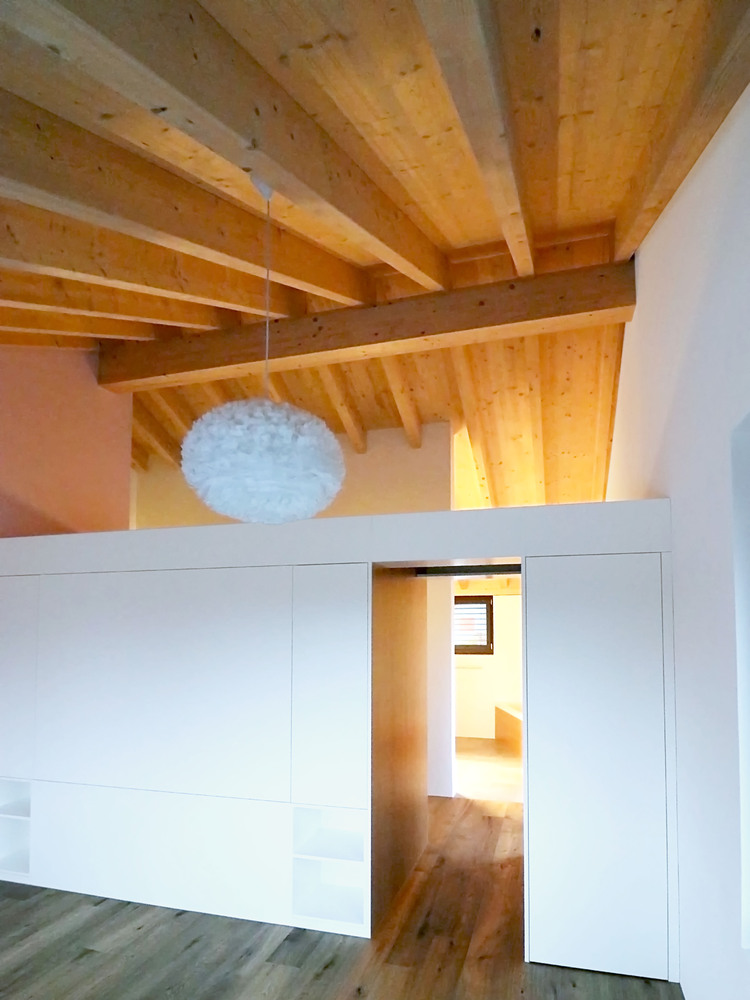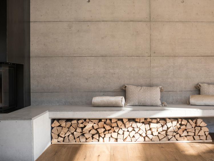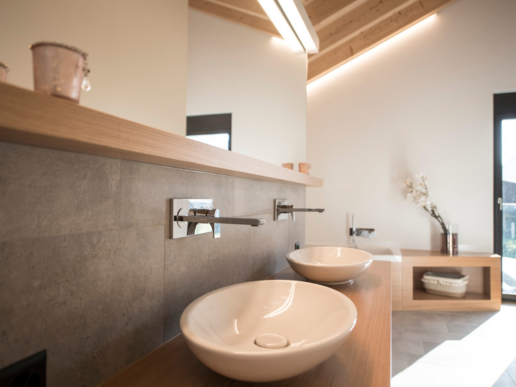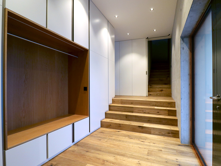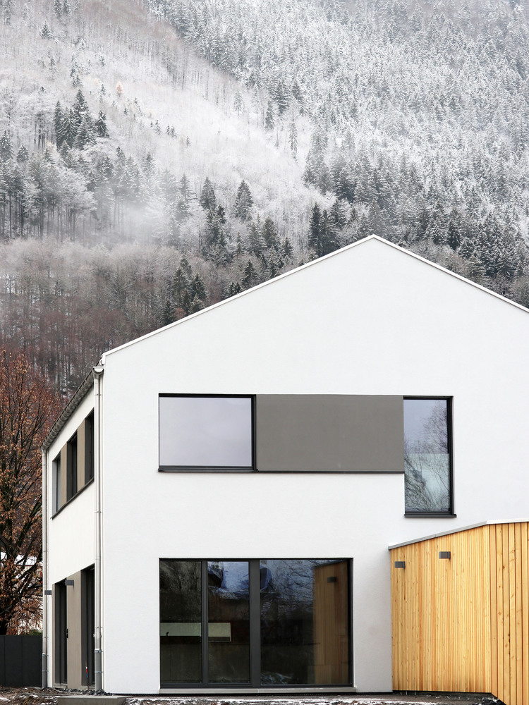 Umgeben ist es von der gewachsenen Dorfstruktur und dem Bach, der entlang der Parzelle ruhig dahin fliesst. Das Einfamilienhaus übernimmt die Typologie des Bestandes, wandelt diese aber auf zeitgenössische Anforderungen um. Durchblicke verbinden die verschiedenen Nutzungen innerhalb des Gebäudes und schaffen damit ständig ändernde Eindrücke und ein grosszügiges Raumgefühl. Die Materialisierung  ist klar und verständlich. Das Erdgeschoss aus Sichtbeton ist Aufenthaltsort für den Tag. Die Nachtbereiche im Obergeschoss sind mineralisch verputzt. Ergänzt wird dies durch sorgfältig detaillierte und materialisierte Einbauten die dem täglichen Leben gerecht werden.
