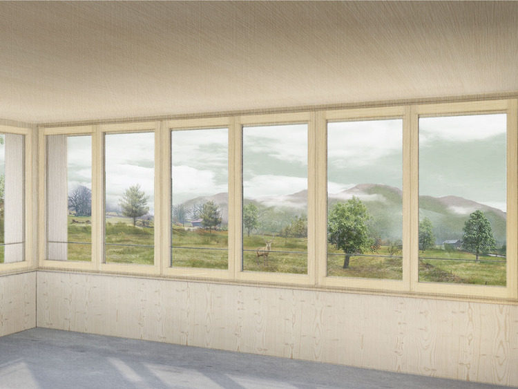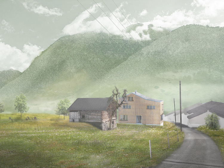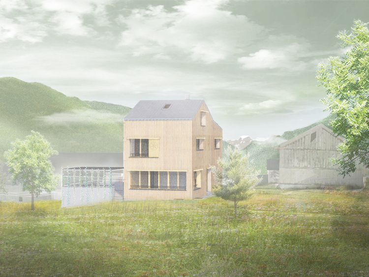 Die Aufteilung in Haupthaus und Nebenbau nimmt Referenz an den ortstypischen Bauten. Zusammen mit der Unterteilung in massiven Sockel aus Beton und einem Holzelementbau in den Obergeschossen fügt sich das Einfamilienhaus so in die Umgebung ein und bildet einen prägnanten Abschluss des Weilers. Eine naturbelassene, feine Lärchenschalung und Holzschiebeläden, verleihen dem Haus Schmuck.