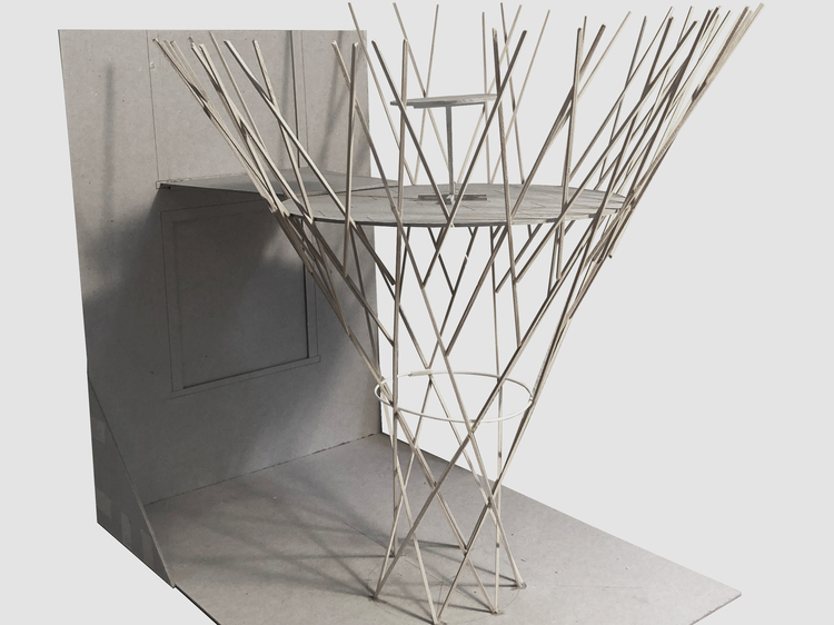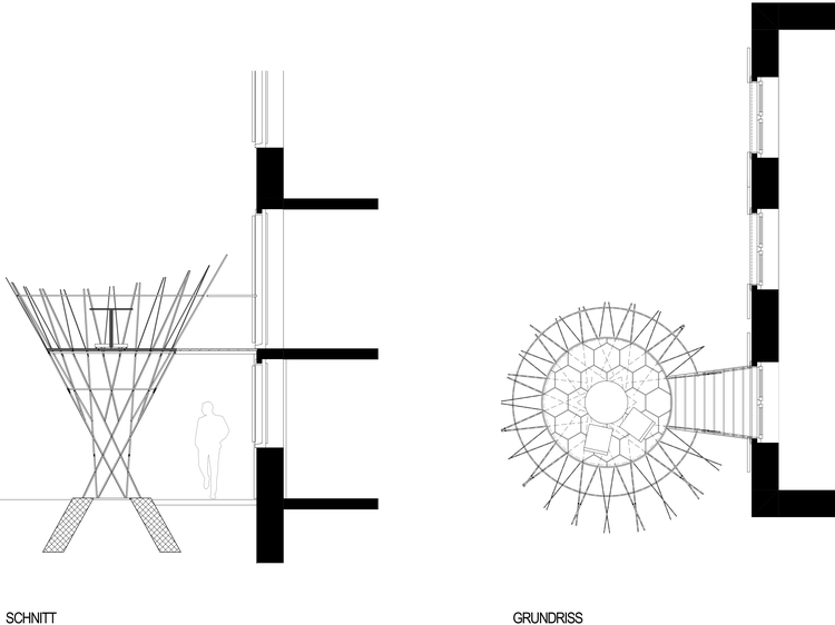 Ein eigenständiges Objekt stellt sich vom Haus losgelöst in den Garten zwischen die nahen Äste. Die Form weckt Assoziationen eines Baumes oder eines Nestes. Die Begrünung, die sich entlang der Konstruktion nach oben rankt, unterstützt den Eindruck. Dem Projekt zugrunde liegt ein optimiertes statisches System. Der hyperbolische Paraboloid erlaubt eine sehr filigrane Konstruktion, die sich in sich selbst aussteift und zugleich die prägnante Form bildet.