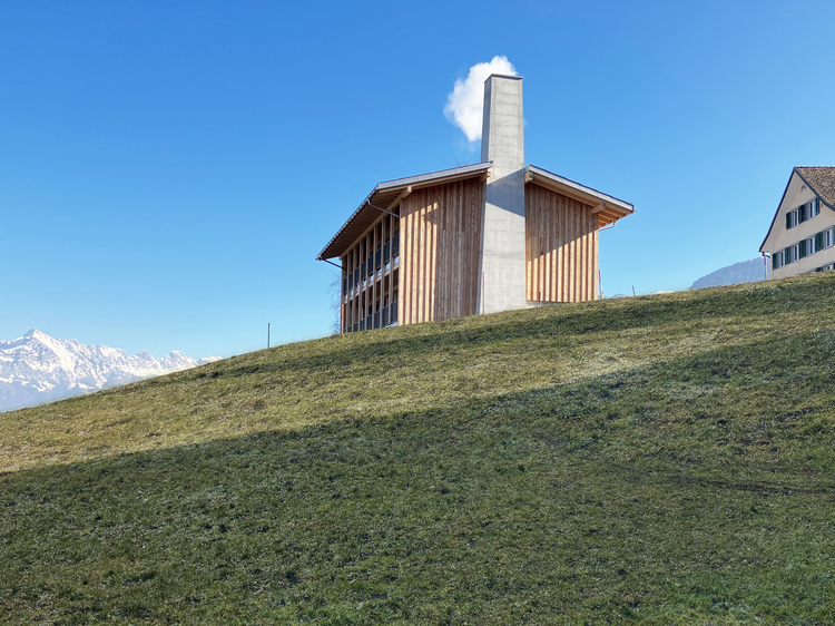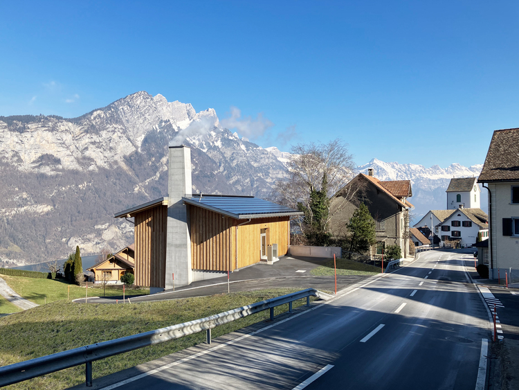 Der Neubau befindet sich direkt an der Dorfeinfahrt, in steil abfallendem Gelände, mit Blick auf Walensee und Churfistenkette. In einer gestaffelten Schnittlösung duckt sich das Gebäude in das Terrain und zeigt sich zur Strasse hin in einer ortsverträglichen Grösse. Die Staffelung in der Höhe löst damit auch die betriebliche Anforderung an die Heizung. Die Schnitzel, aus den eigenen Wälder der Genossame, werden oben befüllt. Unten wird die Asche abtransportiert. Die Büroräume wiederum öffnen sich talwärts, von der Strasse abgewandt und mit Blick Richtung Walensee.