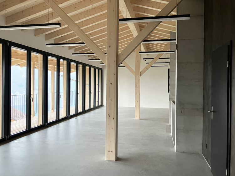 Über dem massiven Sockel stehen zwei Geschosse in Holzelementbau. Die Software- und Webagentur «glit» realisierte hier Büroräume und schafft damit Platz für 10 - 20 Arbeitsplätze. Innerhalb dieser offenen Grundrisse wurde eine mögliche Umnutzung zu Wohnungen bereits eingeplant – sofern dies in ferner Zukunft gewünscht ist.