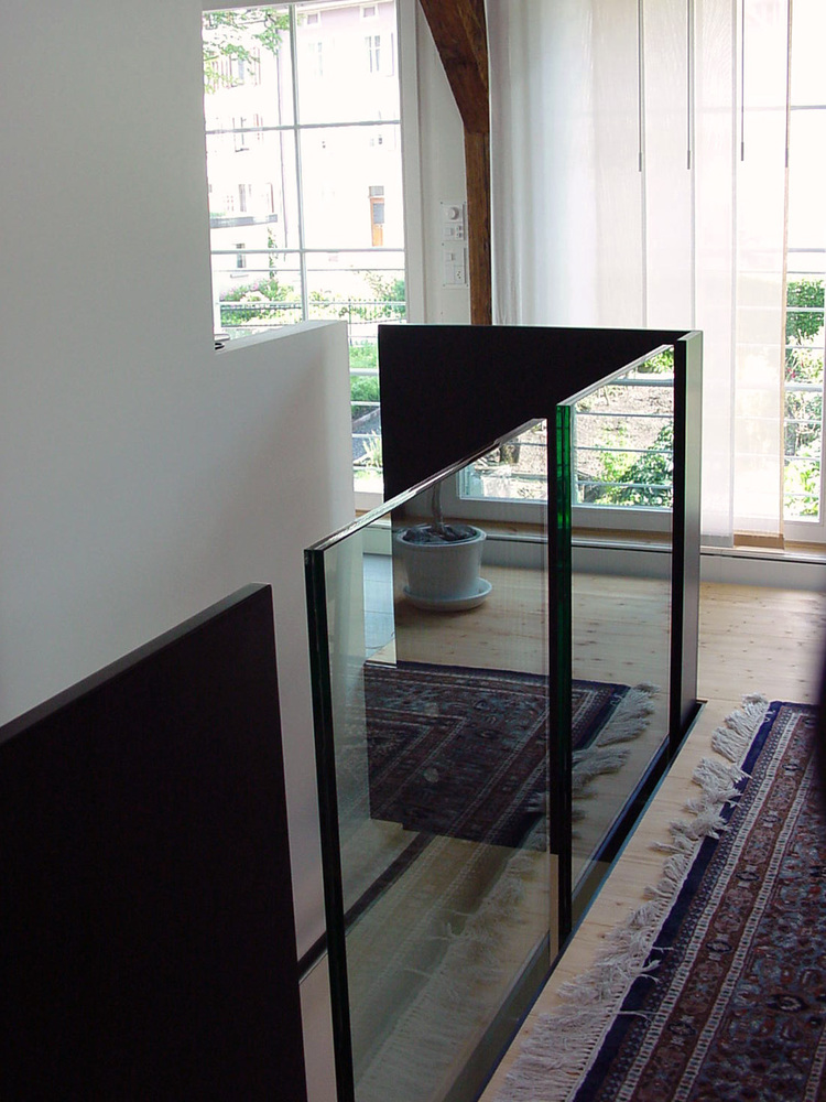 Die Wohnung ist über den Garten von Südwesten her erschlossen. Nebst dem Entrée befinden sich im Erdgeschoss ein neu eingebautes Bad sowie ein separates Zimmer, das ehemalige Kutscherzimmer. Im ursprünglichen Kutschenraum befindet sich heute ein Oldtimer mit 60 Pferden. Im Obergeschoss sind die Küche, ein Wohn-/Essbereich, zwei Zimmer und ein Bad untergebracht. Die Wohnung ist durch die eindrückliche Konstruktion des alten Dachstuhls, der beim Umbau bewusst in Szene gerückt wurde, geprägt. Die Jalousien zur Zaungasse wurden erhalten, indem sie mit einer innenliegenden Fensterschicht versehen wurden. Zum Garten hin wurden die Jalousien entfernt und durch eine Fensterschicht ersetzt, was zu einer sehr guten Belichtung der Räume führte.