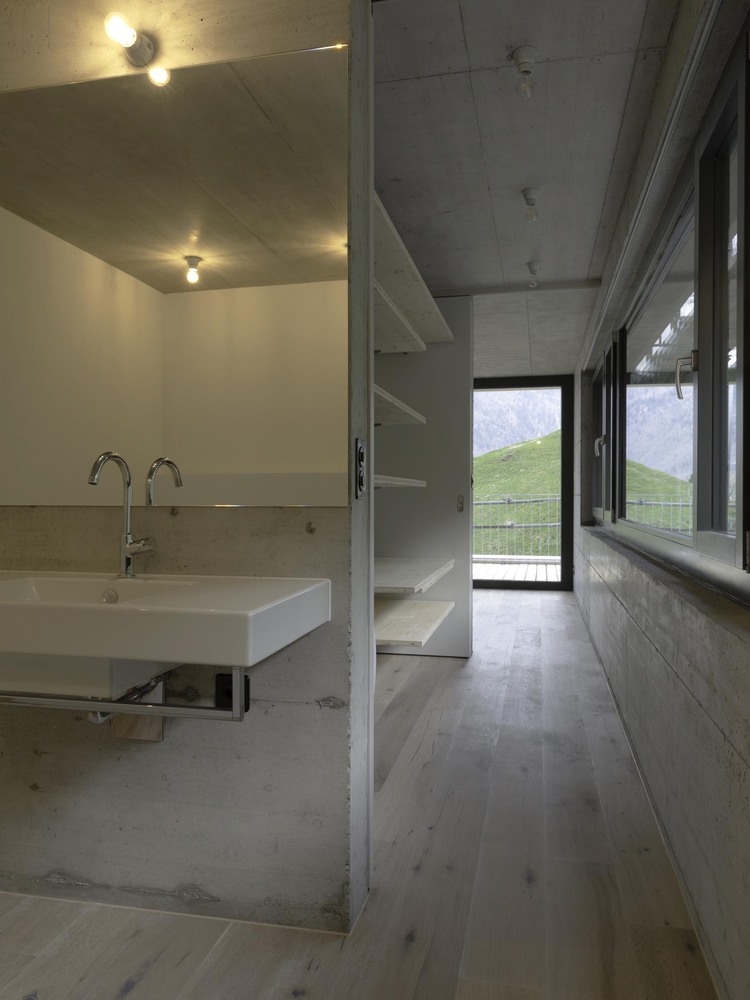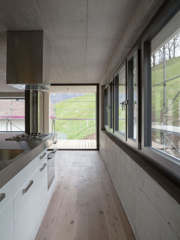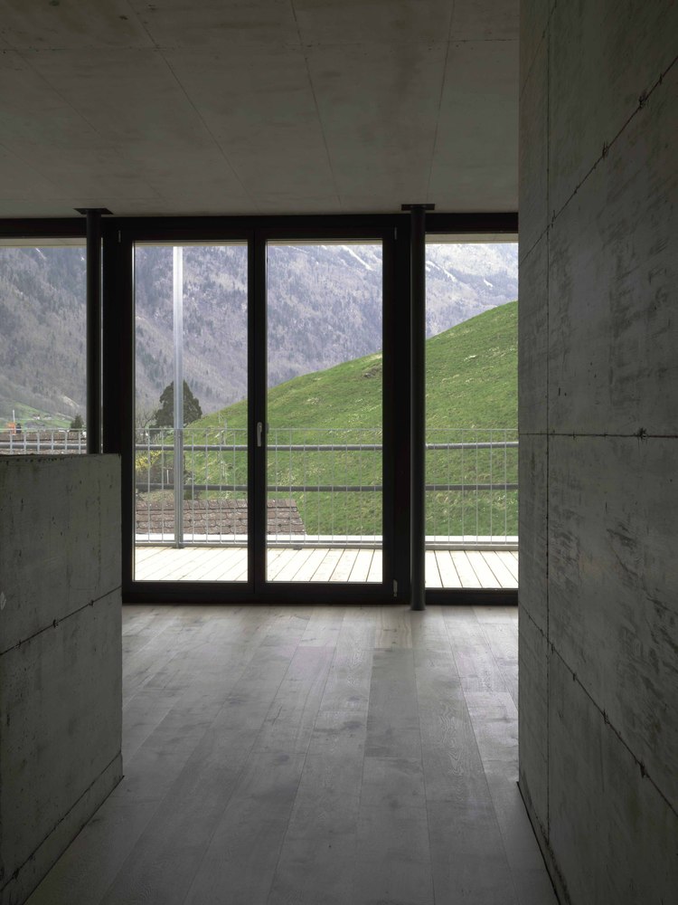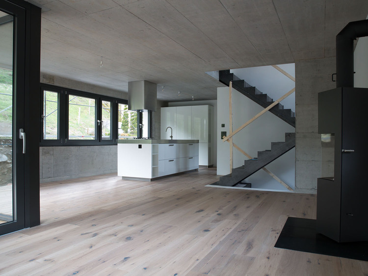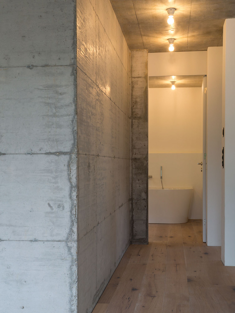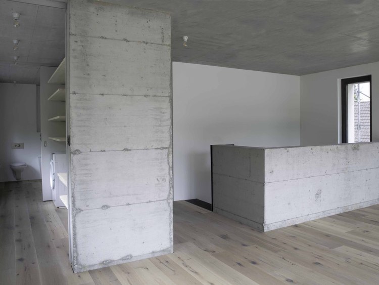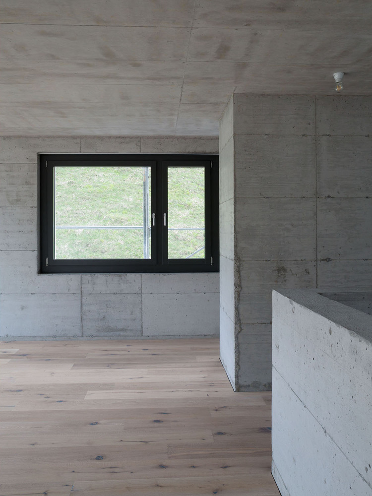 Mit einer sehr offenen Treppenerschliessung werden Eingang und Wohnraum, sowie Wohnraum und Schlafbereich im obersten Stock verknüpft. Fliessende Übergänge der Raumstrukturen, sowie die Kontraste der sparsam eingesetzten rohen Materialien führen zu einer behaglichen Umgebung.